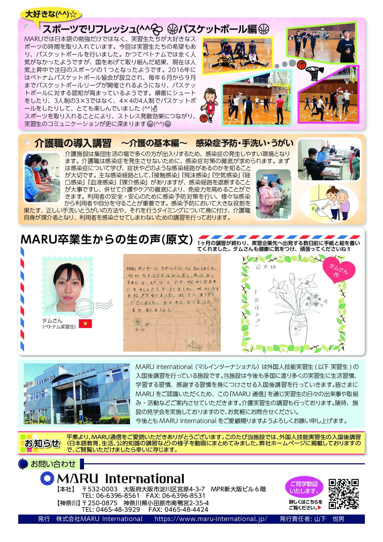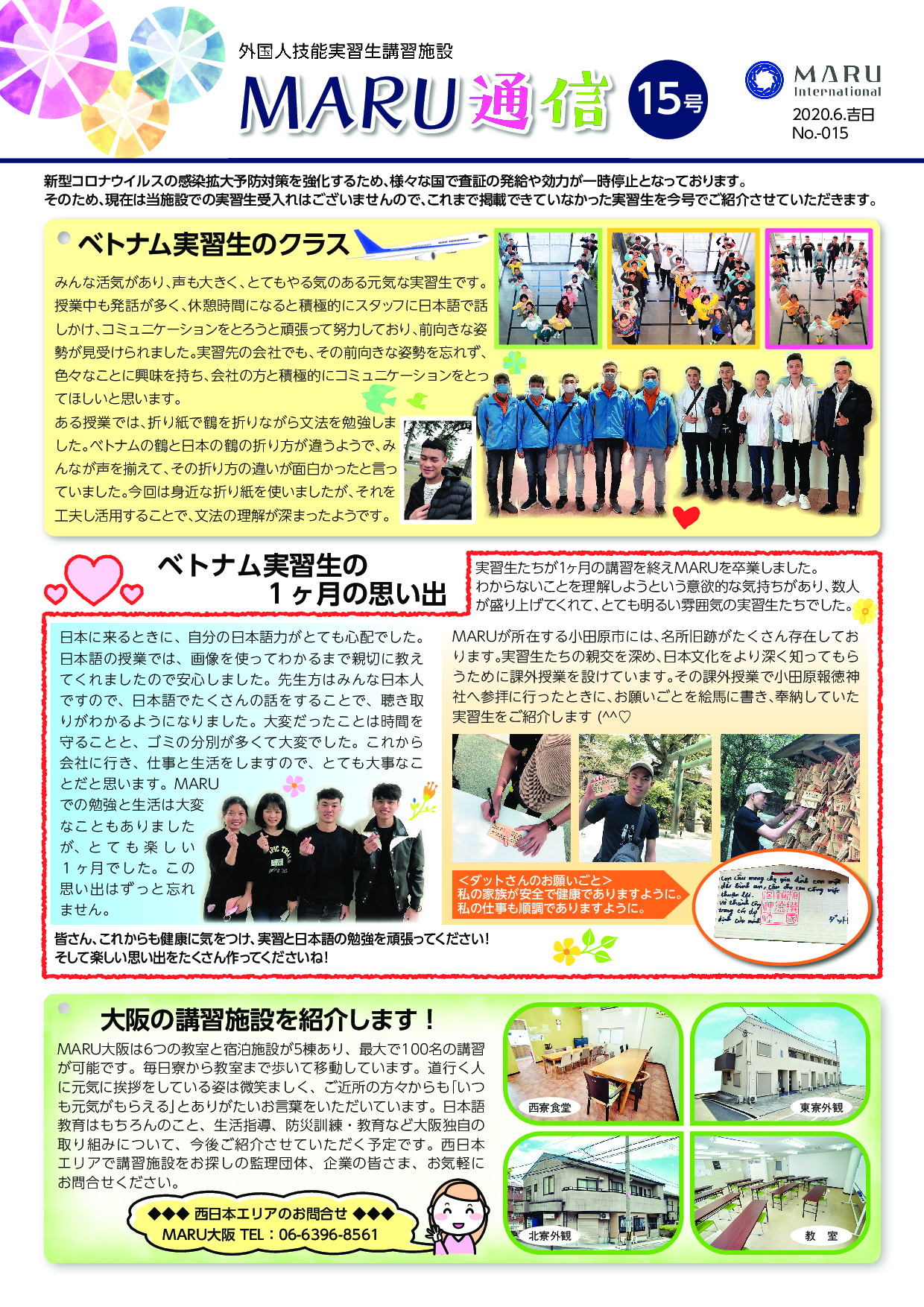 外国人技能実習生の入国後講習の近況を記した『MARU通信15号(6月号)』を発行いたしました。
